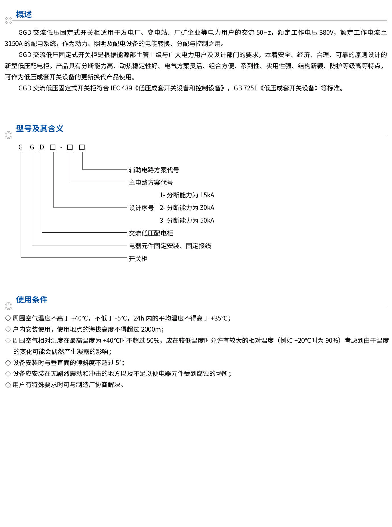 GGD交流低压固定式开关柜适用于发电厂、变电站、厂矿企业等电力用户的交流50HZ,额定工作电压380V,额定工作电流至3150A的配电系统,作为动力、照明及配电设备的电能转换、分配与控制之用。GGD交流低压固定式开关柜是根据能源部主管上级与广大电力用户及设计部门的要求,本着安全、经济、合理、可靠的原则设计的新型低压配电柜。产品具有分断能力高、动热稳定性好、电气方案灵活、组合方便、系列性、实用性强、结构新颖、防护等级高等特点,可作为低压成套开关设备的更新换代产品使用。GGD交流低压固定式开关柜符合EC439《低压成套开关设备和控制设备》,GB7251《低压成套开关设备》等标准。